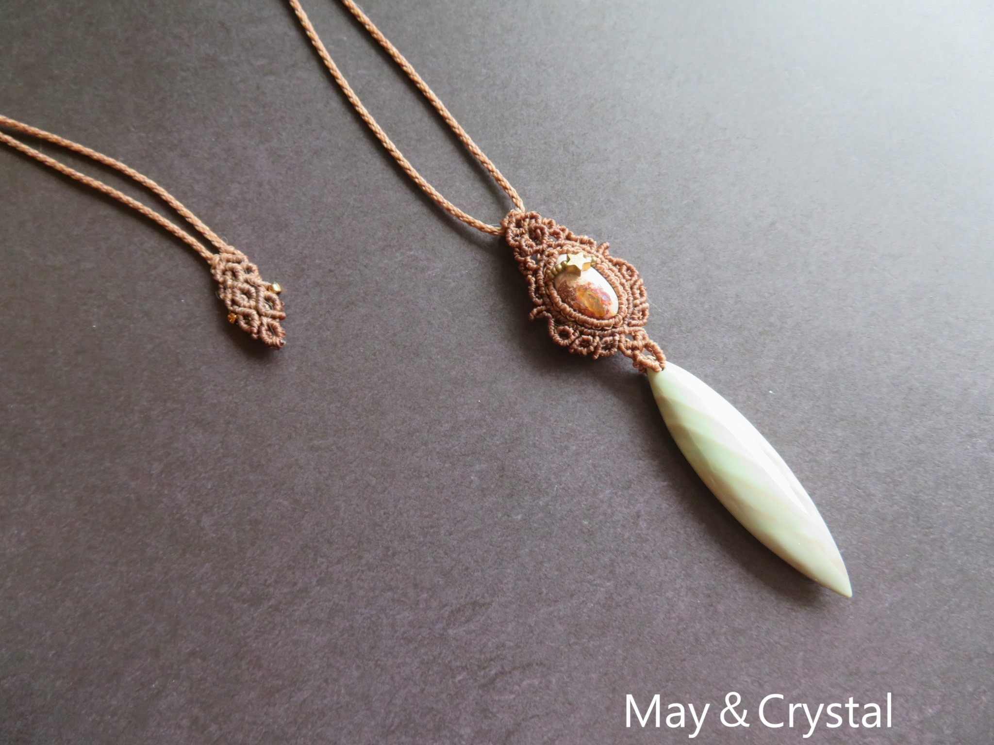 アラシャンアゲートとカンテラオパールを合わせたマクラメ編みのペンダント。