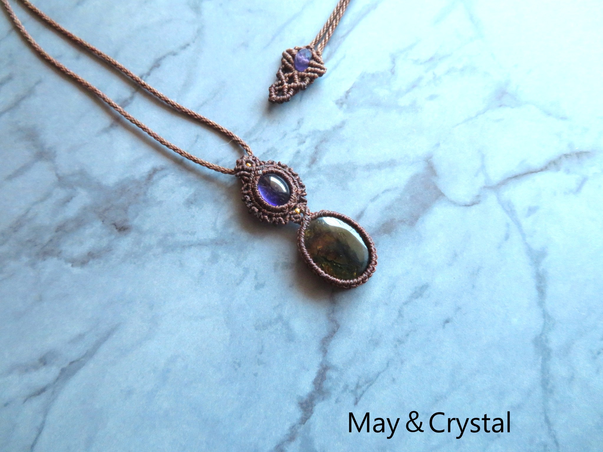 アンバー(琥珀)とアメジストを合わせたマクラメ編みのペンダント。