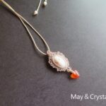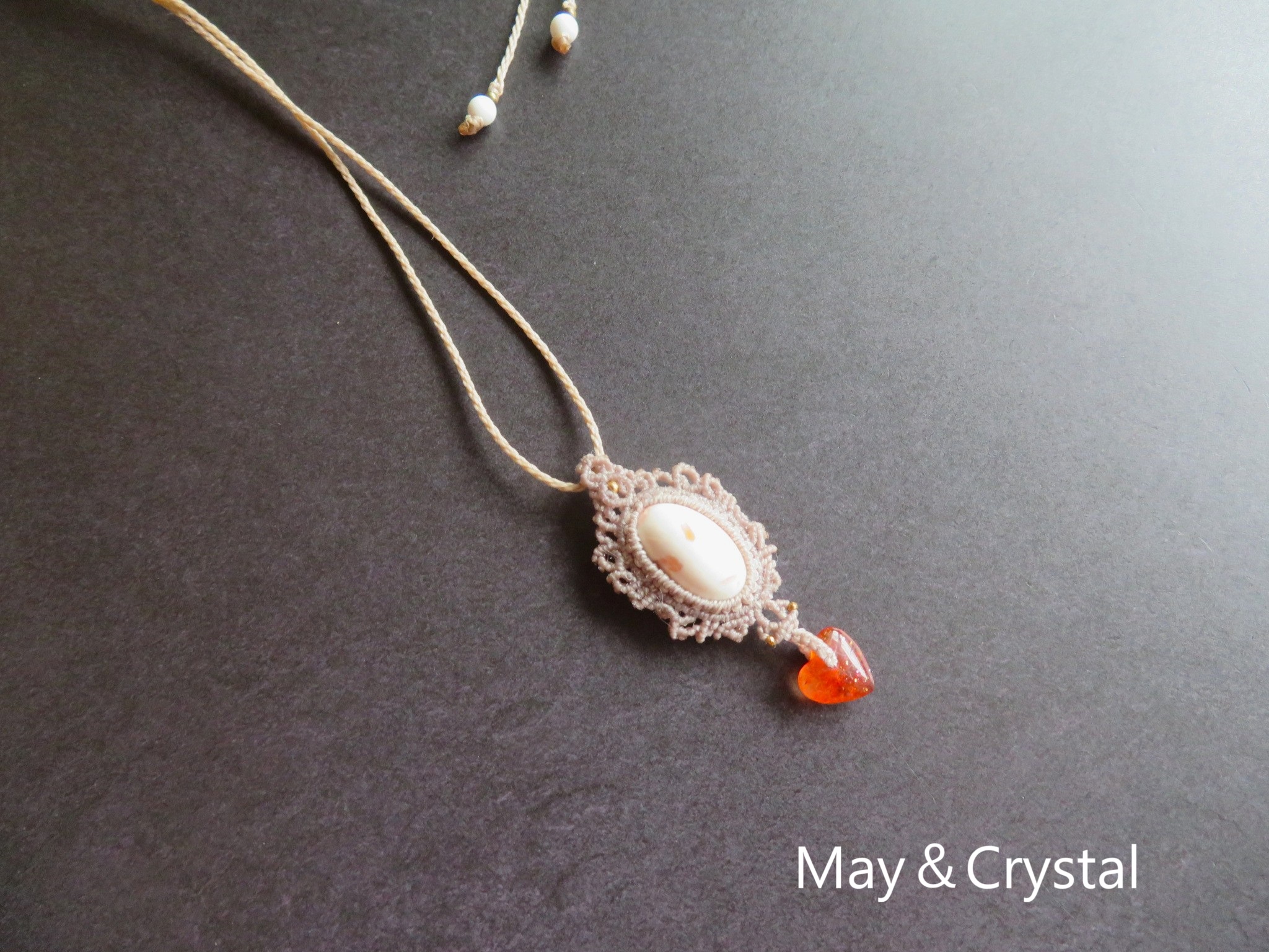 オレンジスコレサイトとハート型のサンストーンを合わせたマクラメ編みのペンダント。
