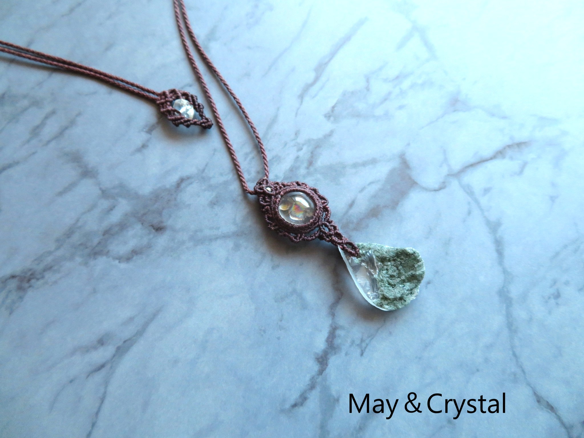 ヒマラヤ水晶とレインボークォーツを合わせたマクラメ編みのペンダント。
