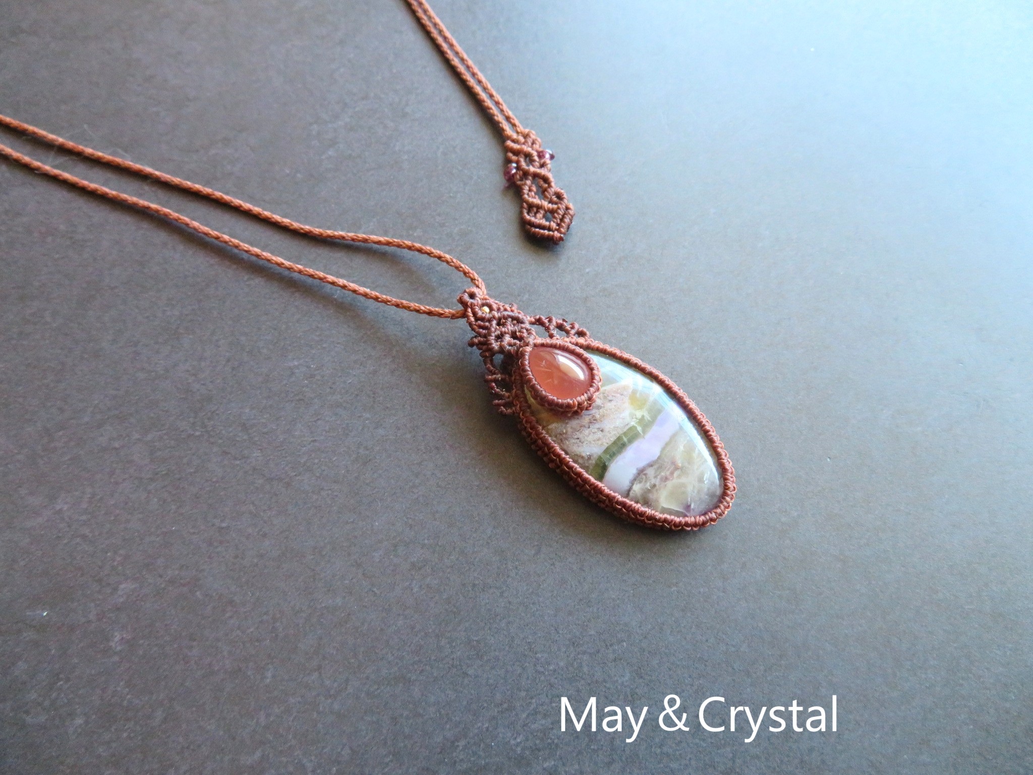 マルチカラーフローライトとロードクロサイトを合わせたマクラメ編みのペンダント。