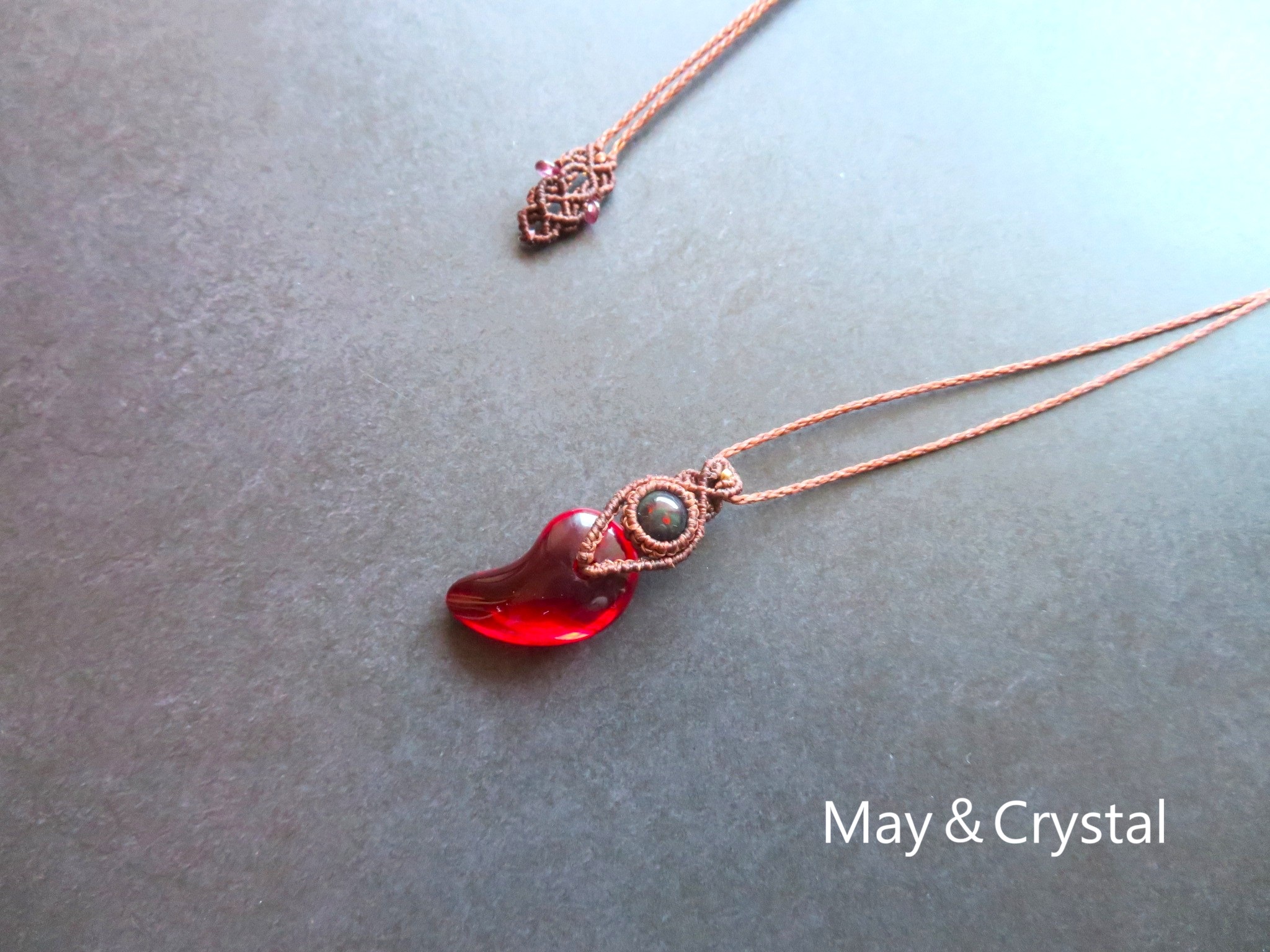 レッドアンバー(琥珀)とブラックオパールを合わせたマクラメ編みのペンダント。