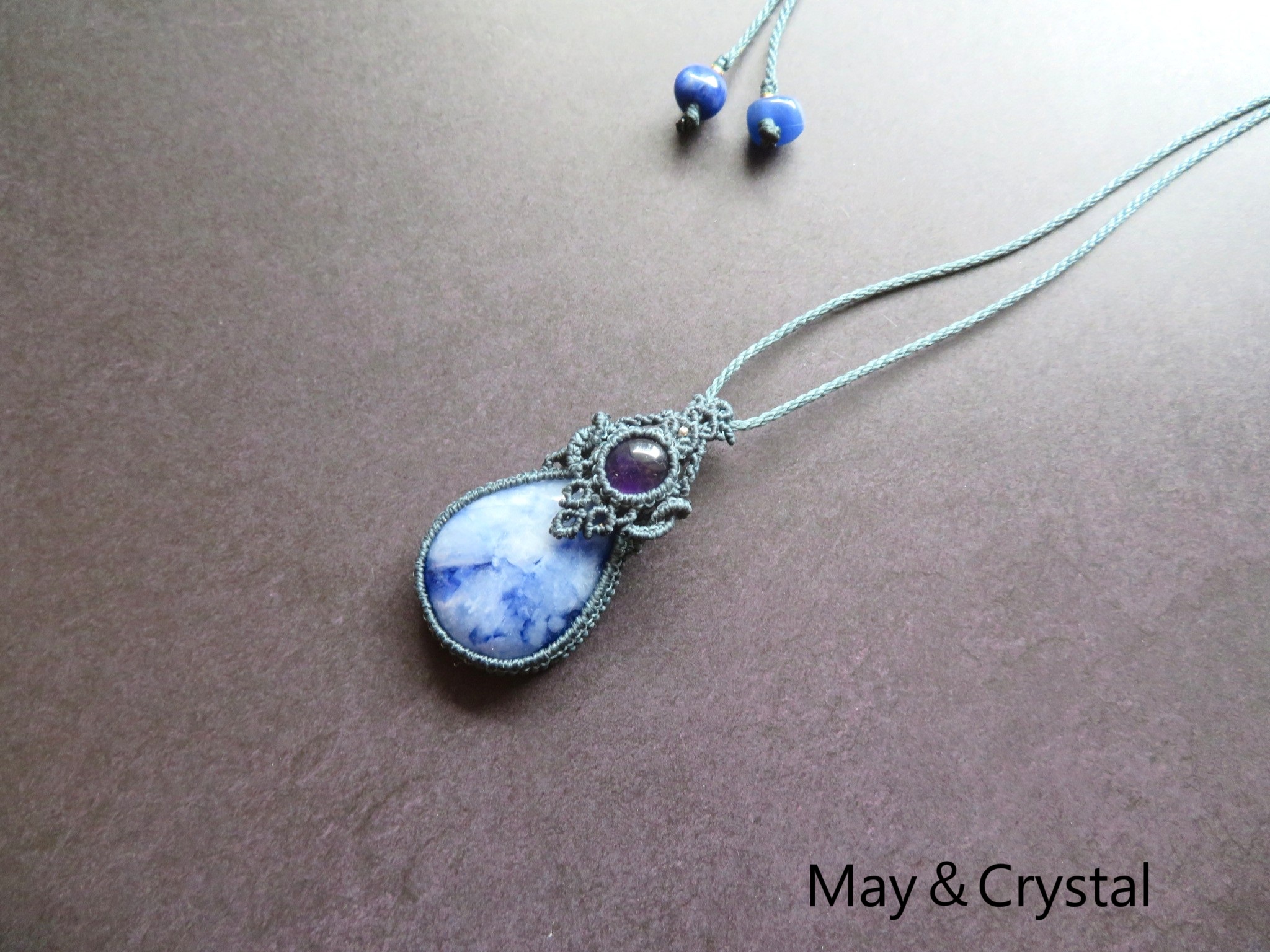 ミステリアスに発光するソーダライトと小粒アメジストを合わせたマクラメ編みのペンダントです。