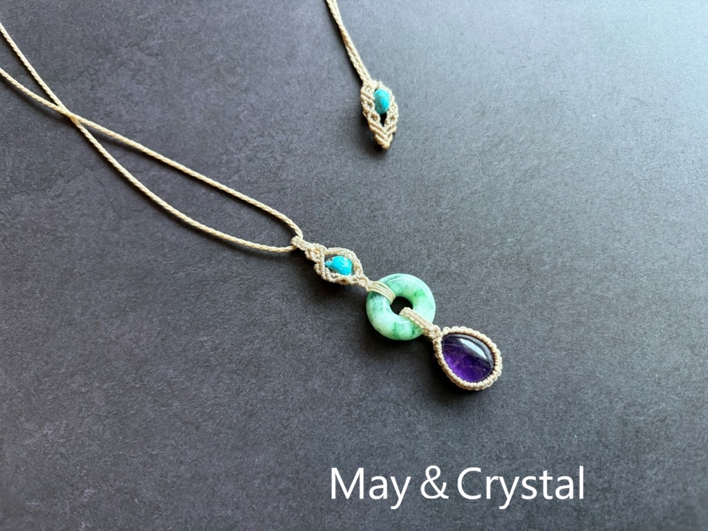翡翠とアメジスト、そしてキングマンターコイズビーズを合わせたマクラメ編みのペンダント。