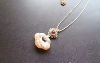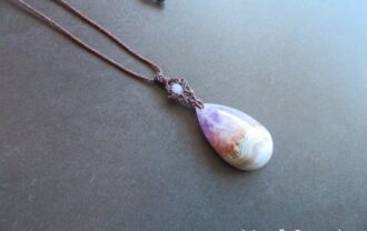 詳細を見るピンクベージュなチェリーブロッサムアゲートと、透明度抜群なピンクトルマリンを合わせたマクラメ編みのペンダント。 チェリーブロッサムアゲートとは名前の通り、アゲート(メ…